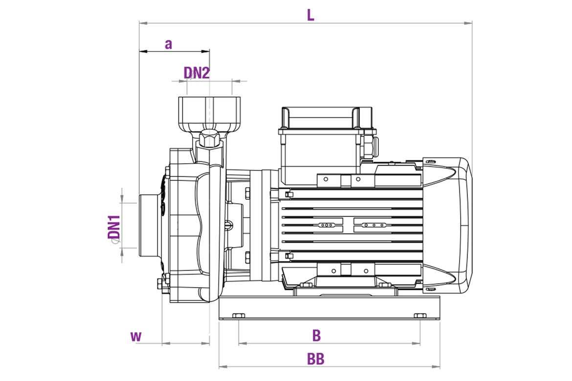 | Single-phase | Three-phase | Hp | Kw | Suction DN1 | Discharge DN2 | L | N | h1 | h2 | h | a | w | A | AB | B | BB | 1~ | 3~ |